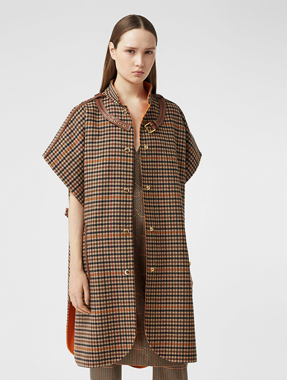 Накидки не назовешь очень практичным видом одежды (при ветреной погоде они доставляют немало хлопот). Но многим нравится их богемный стиль. Ниже вы видите стильную шерстяную накидку из клетчатой ткани с кожаной отделкой и металлической фурнитурой.Эта двусторонняя накидка отличается приятным оттенком кофе с молоком. Модель оживляет полосатая внутренняя сторона. Скрепить полы можно с помощью кожаного пояса или большой декоративной булавки.