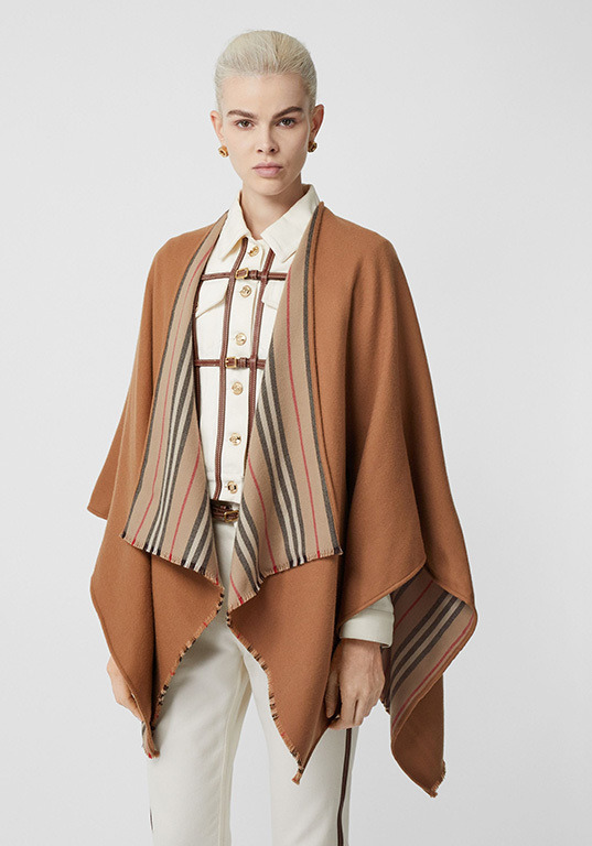 Эта двусторонняя накидка отличается приятным оттенком кофе с молоком. Модель оживляет полосатая внутренняя сторона. Скрепить полы можно с помощью кожаного пояса или большой декоративной булавки.