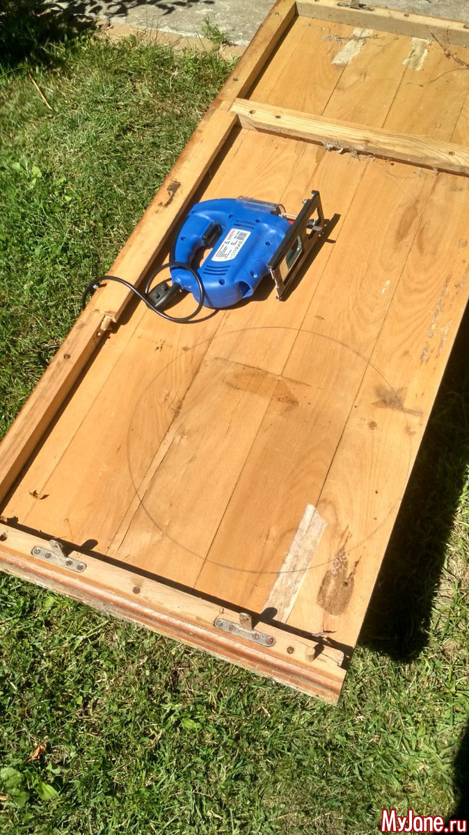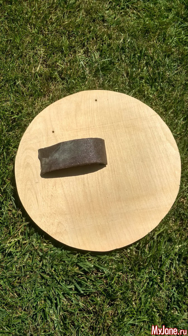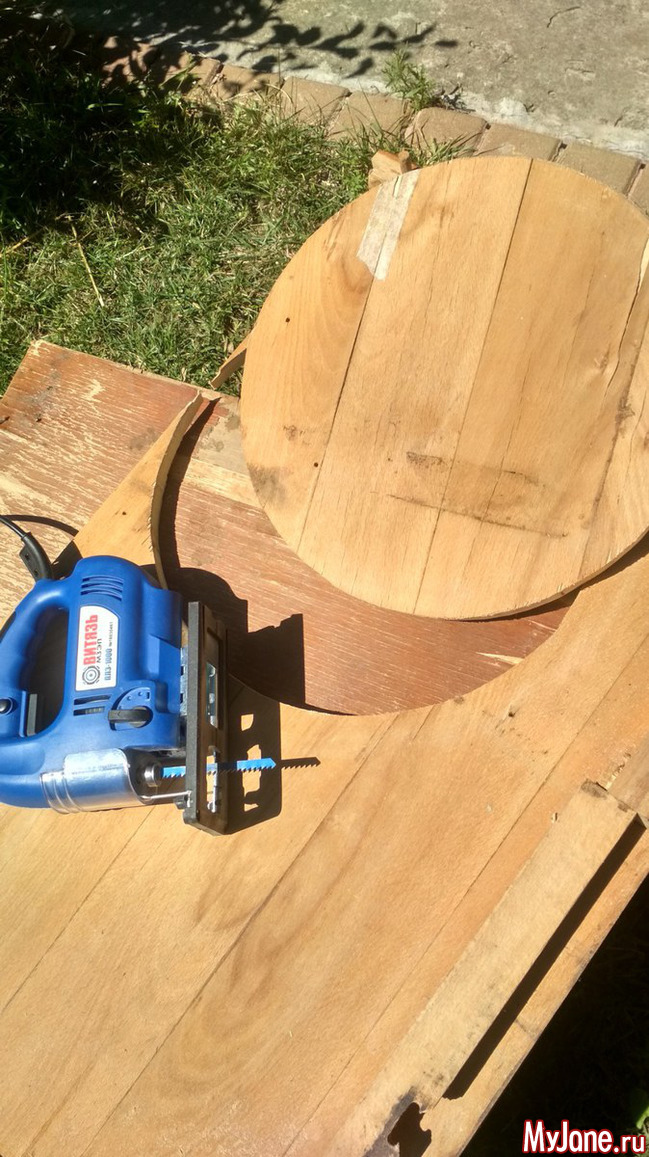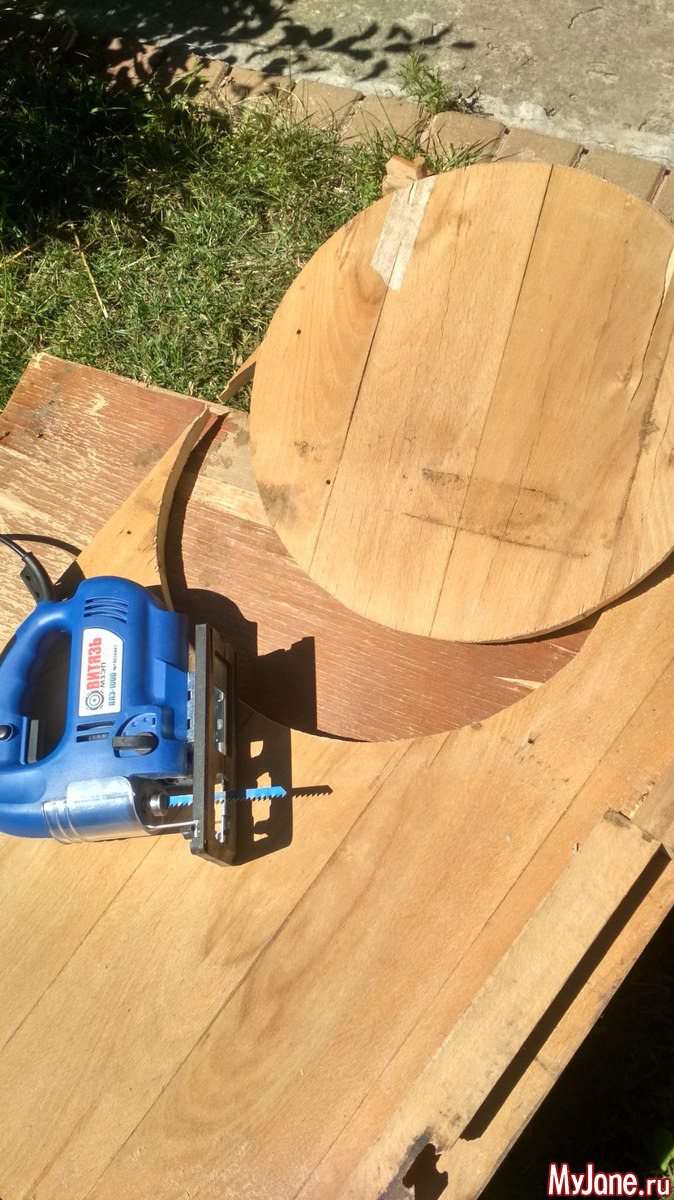 Беру электрический лобзик, очерчиваю круг нужного диаметра (просто сверху положила крышку от большой кастрюли и обвела карандашом) и выпиливаю основу.
