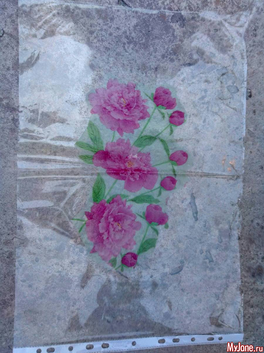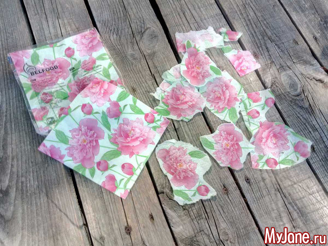 Теперь декорирование. Захотелось использовать декупаж (давно этим не «баловалась»), но на кухне, кроме чисто белых салфеток, обнаружились только с изображением пионов. Тема садовая, так что использую их.