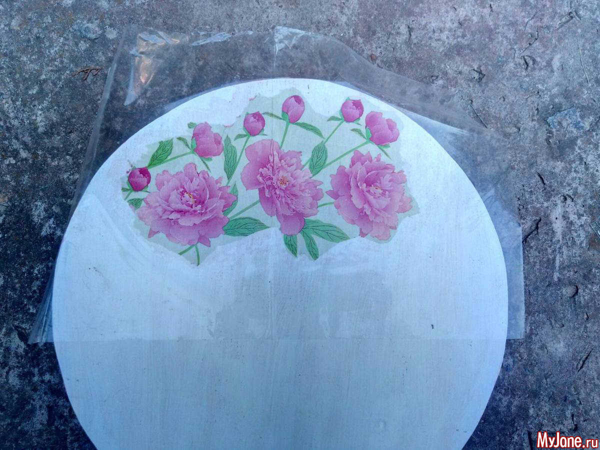Опять покрыла клеем и аккуратно приложила файл (он поверх рисунка) к нужному месту столика. Сухой тряпочкой аккуратно провожу от центра к краям рисунка, тем самым выпускаю пузырьки воздуха и разравниваю его под файлом. Если где-то получаются заломы, их легко исправить. Убедившись, что все ОК, снимаю файл, салфетка плотно легла на поверхность.