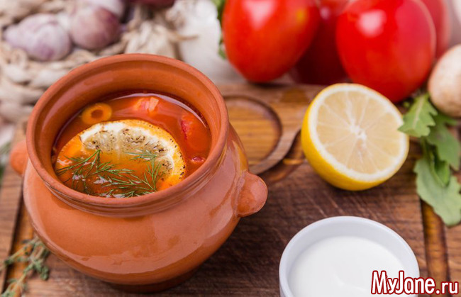 Это блюдо получается густое, сытное, с кисловатым вкусом. Обязательно используется мясо, соленые огурцы, оливки, лимон. Кроме того, в солянке есть морковь, лук. Можно использовать соленые грибы, квашеную капусту, картофель, фасоль.