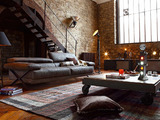 Потолок обычно штукатурят либо обшивают деревянными досками, при этом его поверхность может быть как матовой, так и глянцевой. Проходящие по потолку коммуникационные либо вентиляционные трубы в данном случае не закрывают, да и балки (и деревянные, и металлические), как правило, тоже не трогают. А вот использование натяжных потолков при оформлении помещений в стиле лофт однозначно не приветствуется!Если на потолке имеется лепнина, то ее рекомендуется полностью зачистить, ну а если избавиться от нее совсем жалко, то ее необходимо как минимум покрасить в один цвет со стенами. В целом же при оформлении потолка следует ограничиться использованием простых геометрических фигур, а не причудливых завитушек.