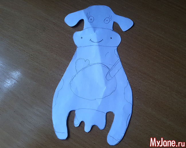 Для начала необходимо построить выкройку будущей игрушки. Можно нарисовать ее самостоятельно, либо воспользоваться шаблоном на фото. Высота этой коровы 22 см. Также сразу можно наметить мордочку, ручки и ножки.