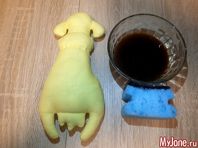 Опускаем губку в кофе, отжимаем и точечными движениями переносим на игрушку. Затем игрушку нужно высушить. Это можно сделать с помощью фена. Многие мастерицы подсушивают такие игрушки в духовке. Повторяем минимум три раза – пропитываем, сушим горячим воздухом.