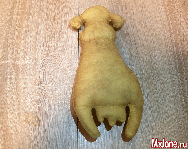 Прошиваем вымя и немного стягиваем ткань. Также прошиваем контур мордочки и немного подтягиваем нить. При необходимости добавляем синтепон, зашиваем боковой шов.