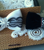 Складываем получившееся кольцо пополам вдоль длинной стороны. Выворачиваем синюю заготовку швами внутрь, совмещаем срезы как показано на фото ниже: белую сложенную вдвое полоску к лицевой стороне синей части.