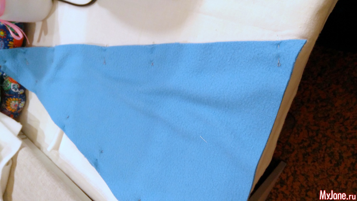 Выкраиваем 2 детали из флиса голубого цвета (для экономии ткани кроим в зеркальном отражении)