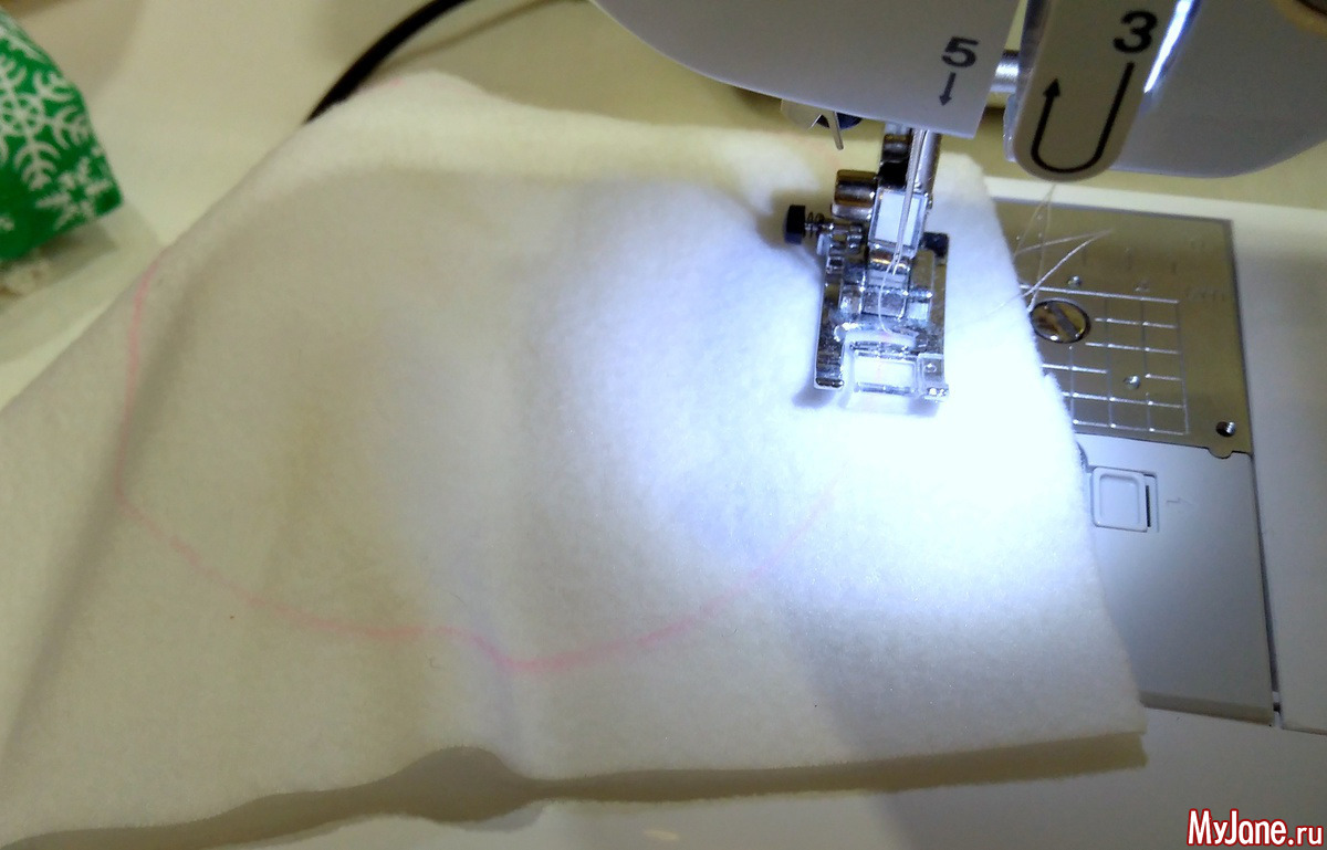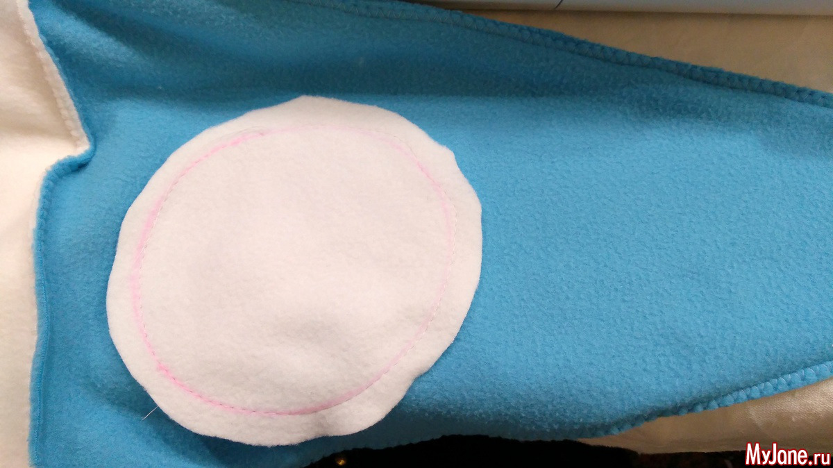 Рисуем на остатке белого флиса круг для помпона, диаметр примерно 12 см. Прокладываем прямую строчку по контуру круга, расстояние между стежками 5 мм.