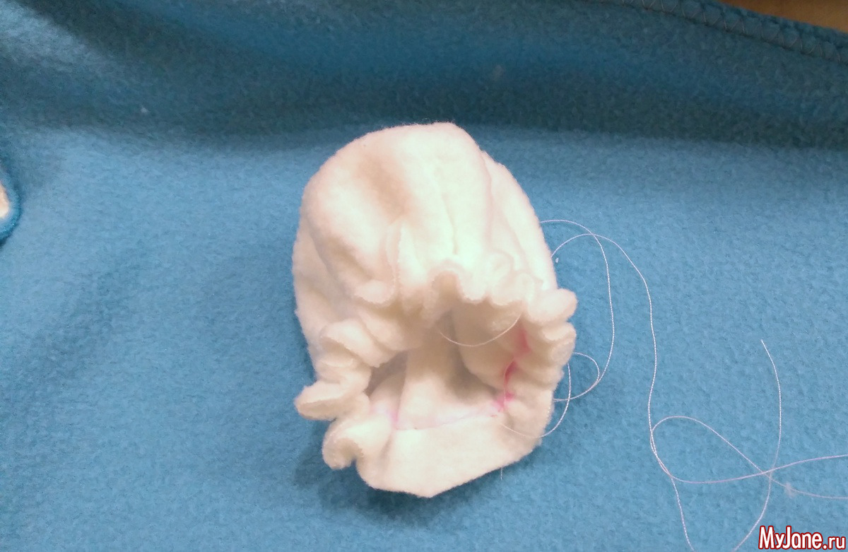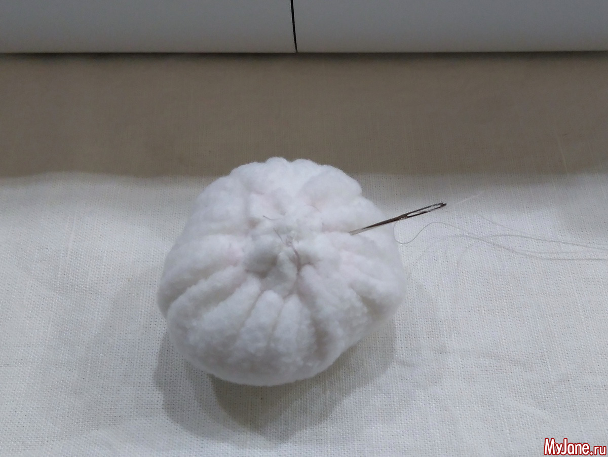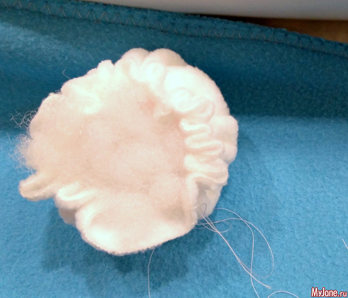 Стягиваем за нитку строчку, формируя выпуклый круглый помпон.