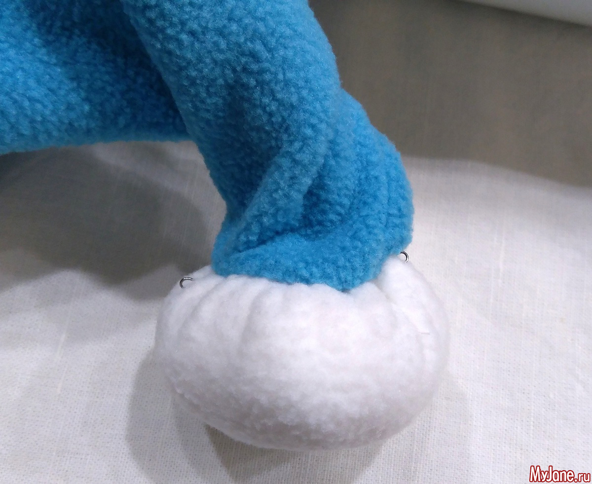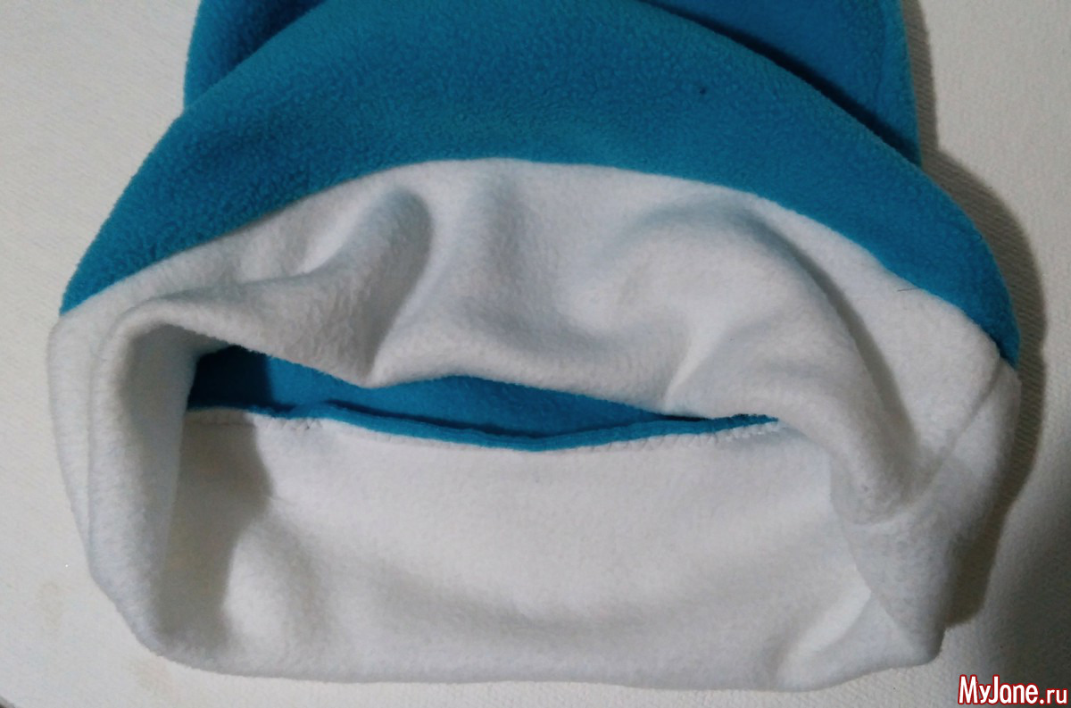 Для колпака понадобится отрезок флиса голубого цвета размером около 40 на 35 см и отрезок флиса белого цвета примерно 70 на 15 см.