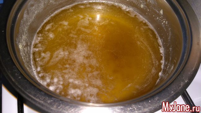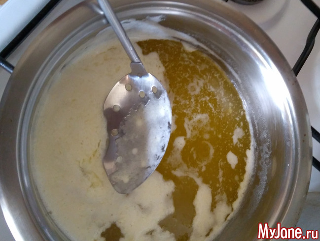 После того, как все масло растопилось, тщательно перемешиваем его и увеличиваем огонь. На поверхности образуется пена из молочного белка, влаги и лактозы.