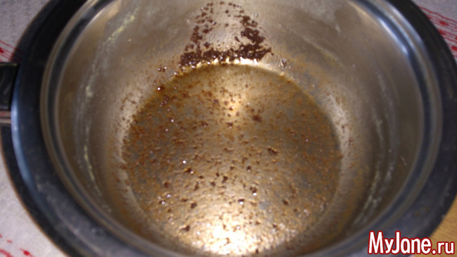 Примерно так выглядит топленое масло спустя 1 час: оно приобрело прозрачность, янтарный цвет и приятный аромат с ореховыми нотками. На дне кастрюли видно небольшое количество потемневшей субстанции, это осевшие на дно карамелизированные сахара.