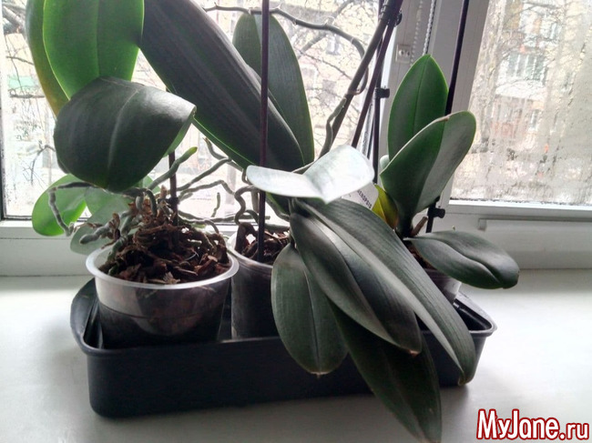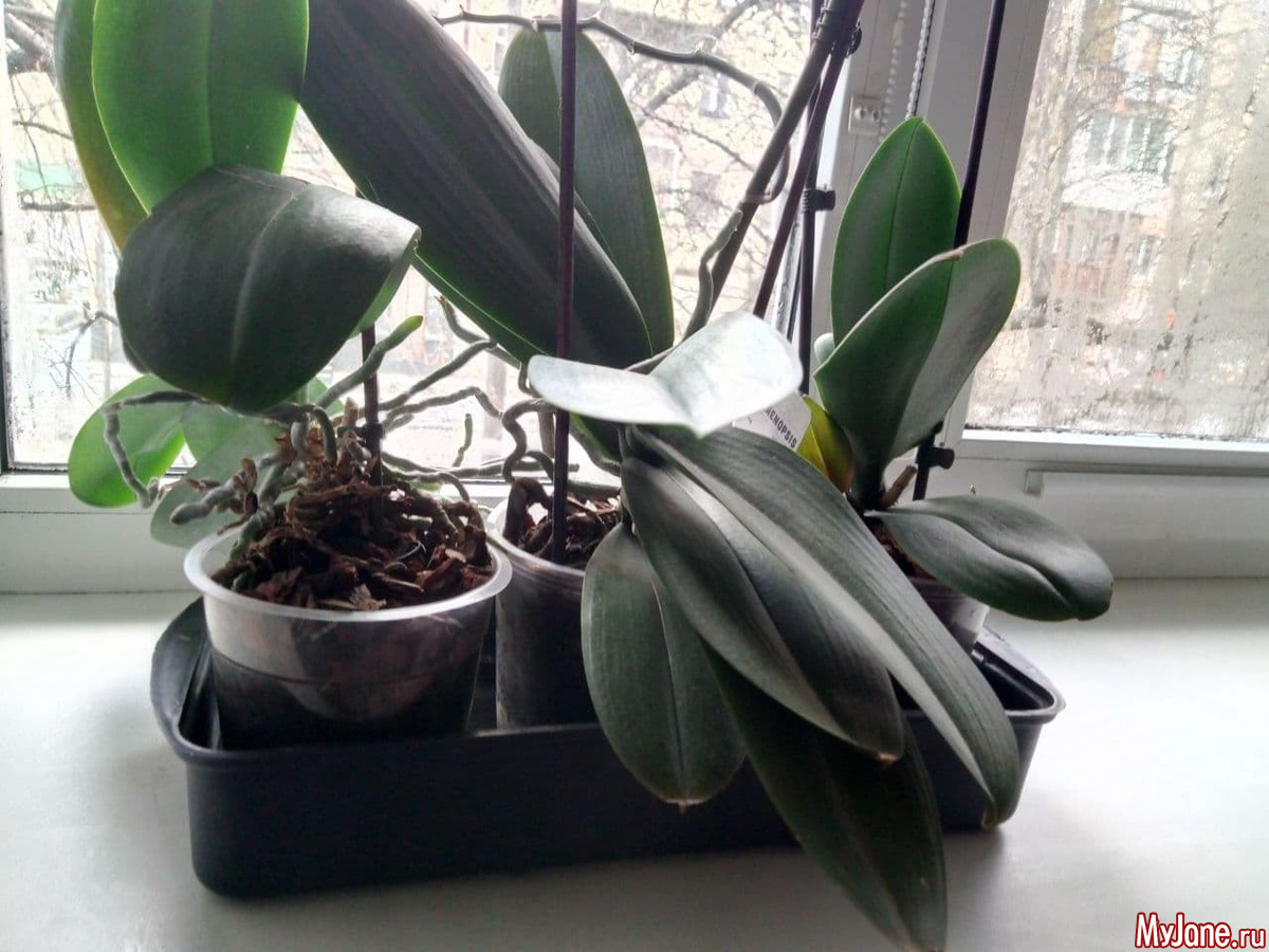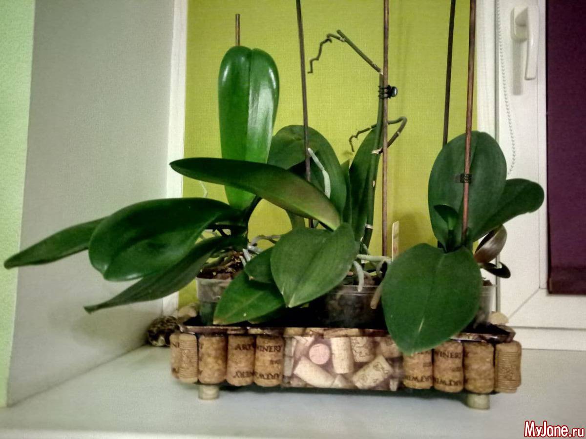 Они компактно в ней располагаются, имеется расстояние между ними, бортики только наполовину прикрывают корни. Пришла мысль, почему бы не приукрасить «поилку» и получить один горшок сразу для трех орхидей. Экономия места на подоконнике, не нужно каждый раз переносить цветы туда-сюда (они этого не любят).
