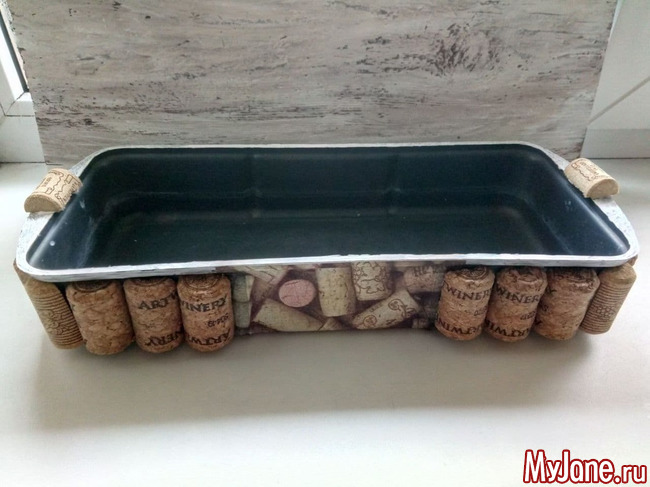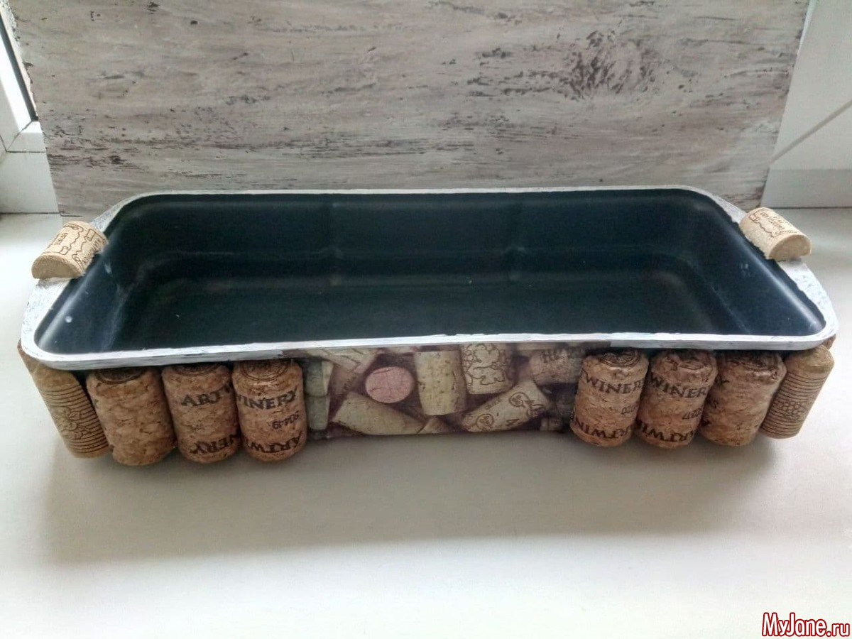 Бортики по периметру обклеиваю половинками пробок впритык. Выбрала одинаковые по размеру, разрезала их вдоль пополам. Верхний бортик также прокрасила и задекорирвала тонкими полосками салфетки (на черном фоне декупаж не виден).