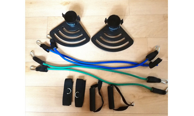 «Gym», как известно с английского языка переводится как «спортзал», «bit» - «кусочек», «bandu» - является производным от «bangee» - «резинка». Вот и получается, что Gymbit bandu – это тренировочная система, домашний мини-спортзал на основе резинок – эспандеров. Включает она в себя две пары таких резинок – разного уровня эластичности и соответственно сложности. Зеленые – для новичков в силовых тренировках, синие – для более продвинутых любителей домашнего фитнеса. Оба конца всех эспандеров венчают карабины. Один из них прикрепляется к специальной платформе – фиксаторе под ножкой стула, а ко второму концу эспандера в зависимости от выбранного упражнения прикрепляется либо ручка, либо лента с липучкой для закрепления на щиколотках. Вся конструкция легко собирается, занимает мало места и стоит около 2 тысяч рублей в интернет-магазинах.