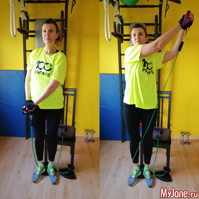 Исходное положение то же, что и в предыдущем упражнение. На этот раз, преодолевая сопротивление резинок, поднимайте руки до линии горизонта перед собой. Повторите движение 10 раз. Работает плечевой пояс, спина, руки.