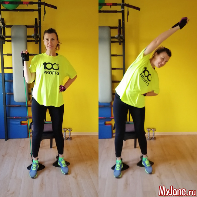 Снова отложите один эспандер, согнутой в локте рукой удерживайте ручку второй резинки на уровне плеча. Выполняйте наклон корпуса в сторону, противоположную удерживаемому эспандеру, одновременно выпрямляйте рабочую руку с эспандером вдоль головы. Выполните 10 таких наклонов. Затем возьмите другой эспандер и повторите упражнение в противоположную сторону. Упражнение хорошо сжигает жир на талии.