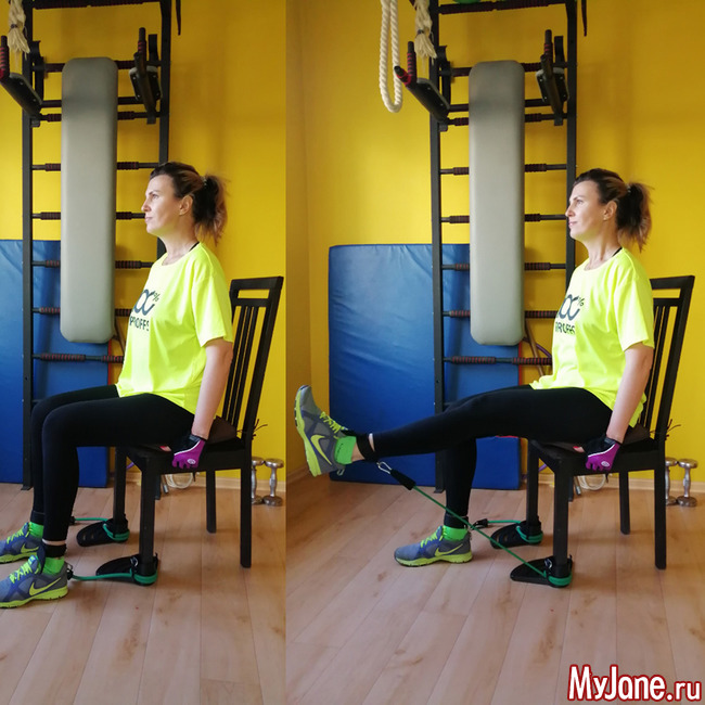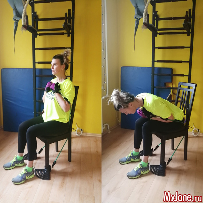 Теперь пропустите эспандеры под сидением стула и возьмитесь за ручки из-за спины. Присаживайтесь на стул. Растягивая резинки, выполните наклон корпуса к коленям. Повторите движение 20 раз. Работает пресс.