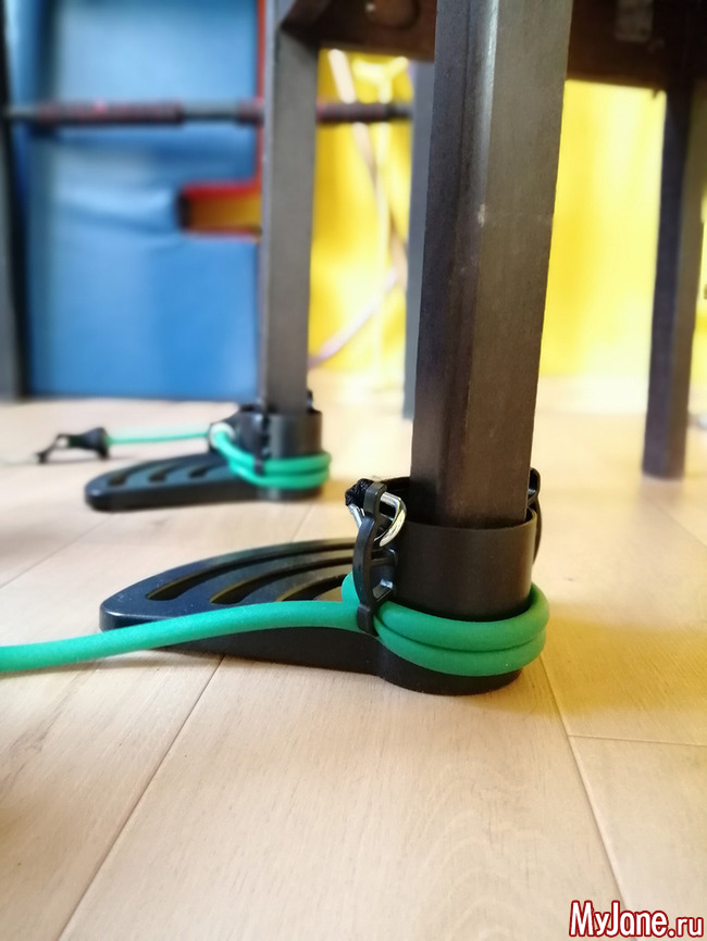 Для выполнения второй части тренировки обвейте несколько раз эспандеры вокруг ножек стула. Это укоротит их для более эффективного выполнения последующих упражнений.