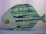 Иногда, вещь быстро «выстреливает», здесь же у меня несколько вечеров моя рыба меняла свой окрас. Но, это тоже полезно, узнаешь опытным путем что-то новое, что пригодится потом. Поработав с покраской, снять скотч, что-то подправить, нарисовать глаз золотой краской – всё. Рыба получилась многоцветная, где-то проступает рисунок от сетки. Собственно, так я ее примерно и представляла, для моего интерьера подходит.