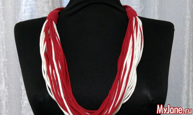 Из остатков футболки выкраиваем ту часть бус, которая будет располагаться сзади на шее. По краям на выкройке делаем расширения (с обеих сторон), в которые впоследствии вставим закреплённые трикотажные трубочки. Края срезов подгибаем внутрь. Прокладываем строчки на швейной машинке. Используем иглу для трикотажа, так как обычная швейная игла может пробить трикотажное полотно.