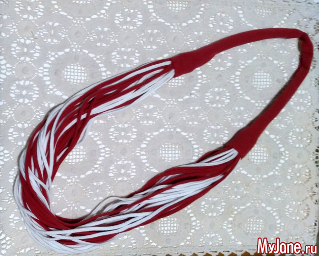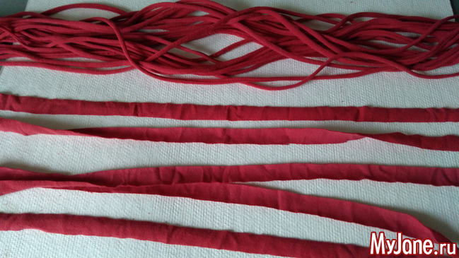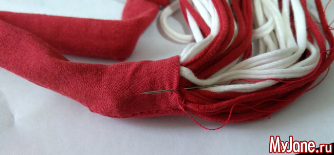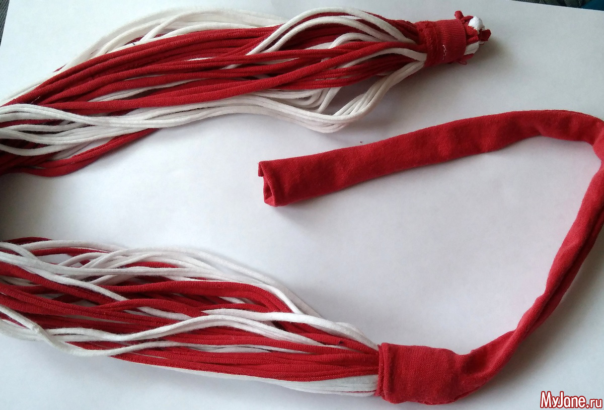 У меня остались полоски из белой футболки, так как эта футболка была больше размером, соответственно полоски оказались длиннее, поэтому швейная машинка не понадобилась, края полосок просто соединены между собой и плотно обмотаны трикотажными трубочками. Края трубочек в конце обмотки продеты под предыдущие витки.