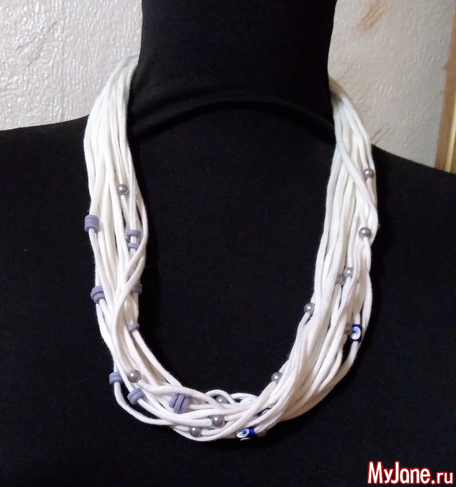 Для того, чтоб протянуть трикотажную полоску через отверстие бусины, нужно срезать край полоски наискосок и скрутить его в пальцах, утончая край.