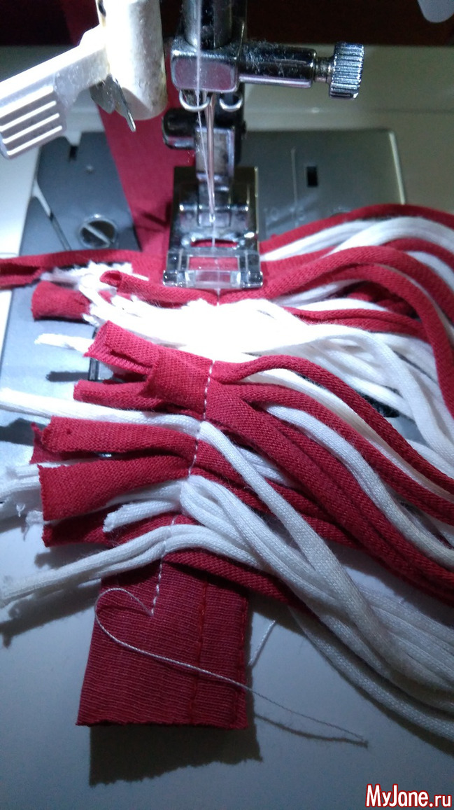 Выворачиваем выкройку и вставляем в отверстия свернутые пучки полосок.