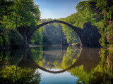 Это изумительное сооружение. Мост создан из базальтовых колонн в 1860 году. Базальт здесь не находили, поэтому его везли из Швейцарии и Богемии. Из него создали также скалы, гроты и пирамиды, которые украшают парк.Мост представляет собой идеальное в своей полуокружности сооружение. Именно его удивительная геометрия связала с ним множество мифов и поверий. Это 35-метровая каменная дуга, перекинутая над водой. Над всем этим нависают ветви раскидистых деревьев. Независимо от того, где вы стоите, он и его отражение будут сливаться в идеальный круг. Важная роль в этом отводится уровню воды. Однако легенды объясняют это участием в строительстве моста самого нечистого. Серый и загадочный материал, из которого создана переправа, базальтовые зубья, вырывающиеся из земли перед входом на мост, безмятежная водная гладь, тишина и умиротворение природы создают здесь уникальную атмосферу. В этом месте невозможно не ощутить благоговейный трепет. Невозможно представить даже, что все это создано человеческими руками.