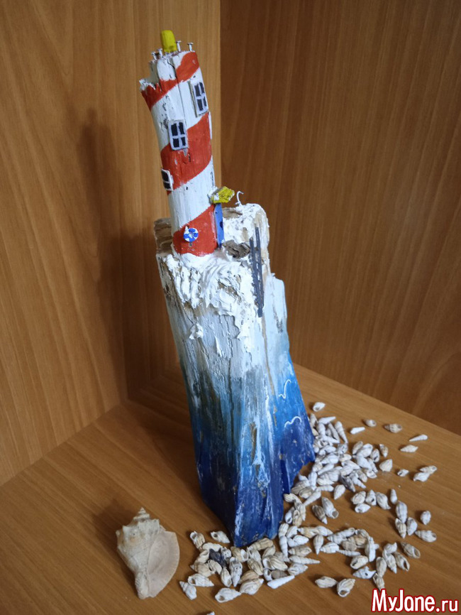 Так как верхняя основа не ровная, маяк приподняла с одной стороны, сделала подушку при помощи шпаклевки. Кору приклеила в качестве крыши на домик и покрыла лаком, так как она сухая. В надрез у ствола поместила несколько ракушек (приклеила их).