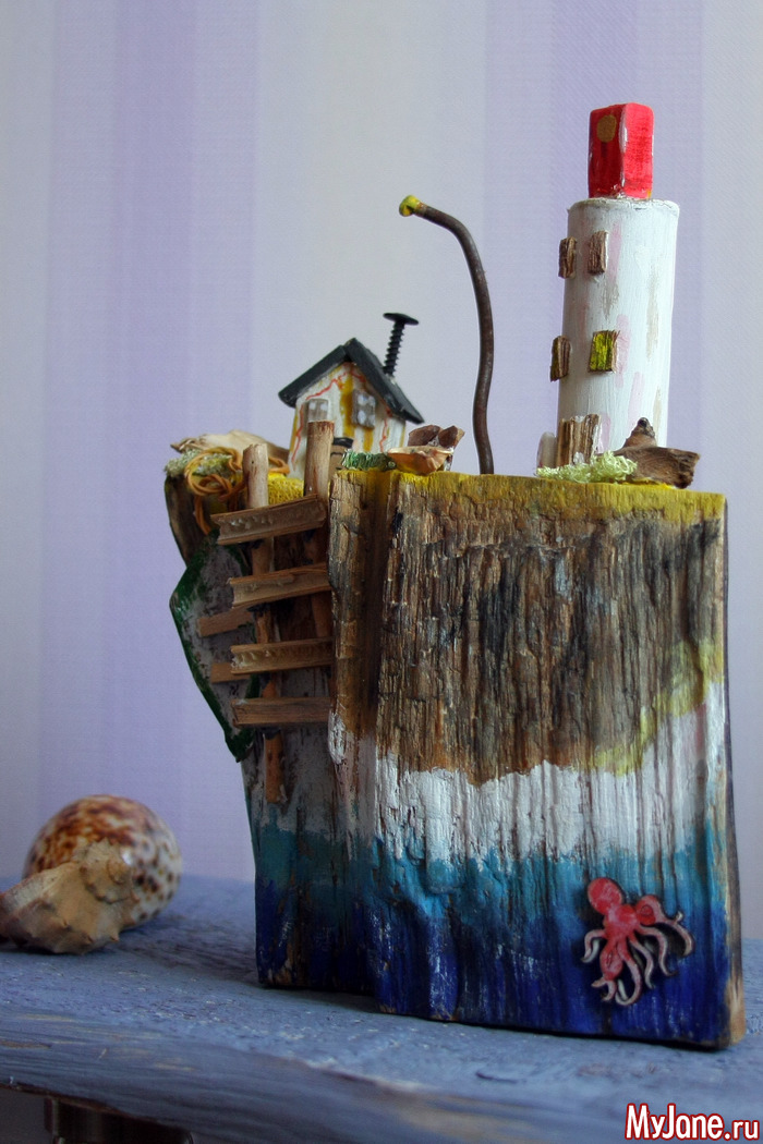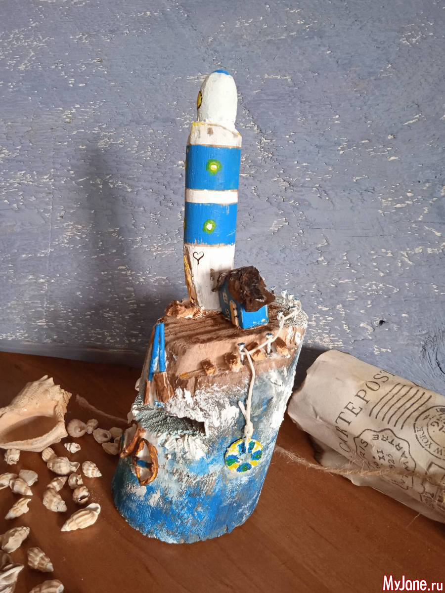 Немного детальнее покажу, как я собирала маленький маяк. Основа – кусочек ствола сирени,