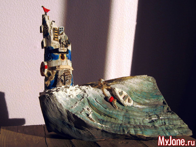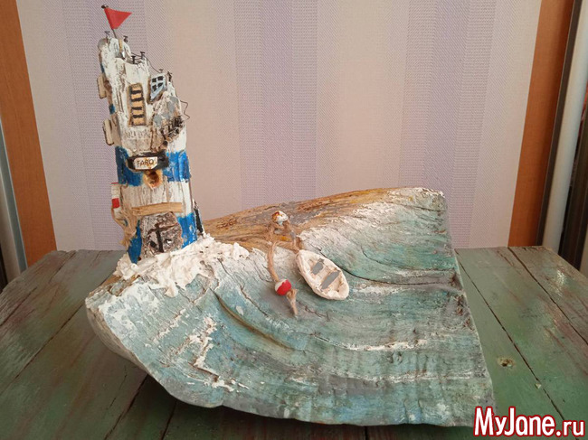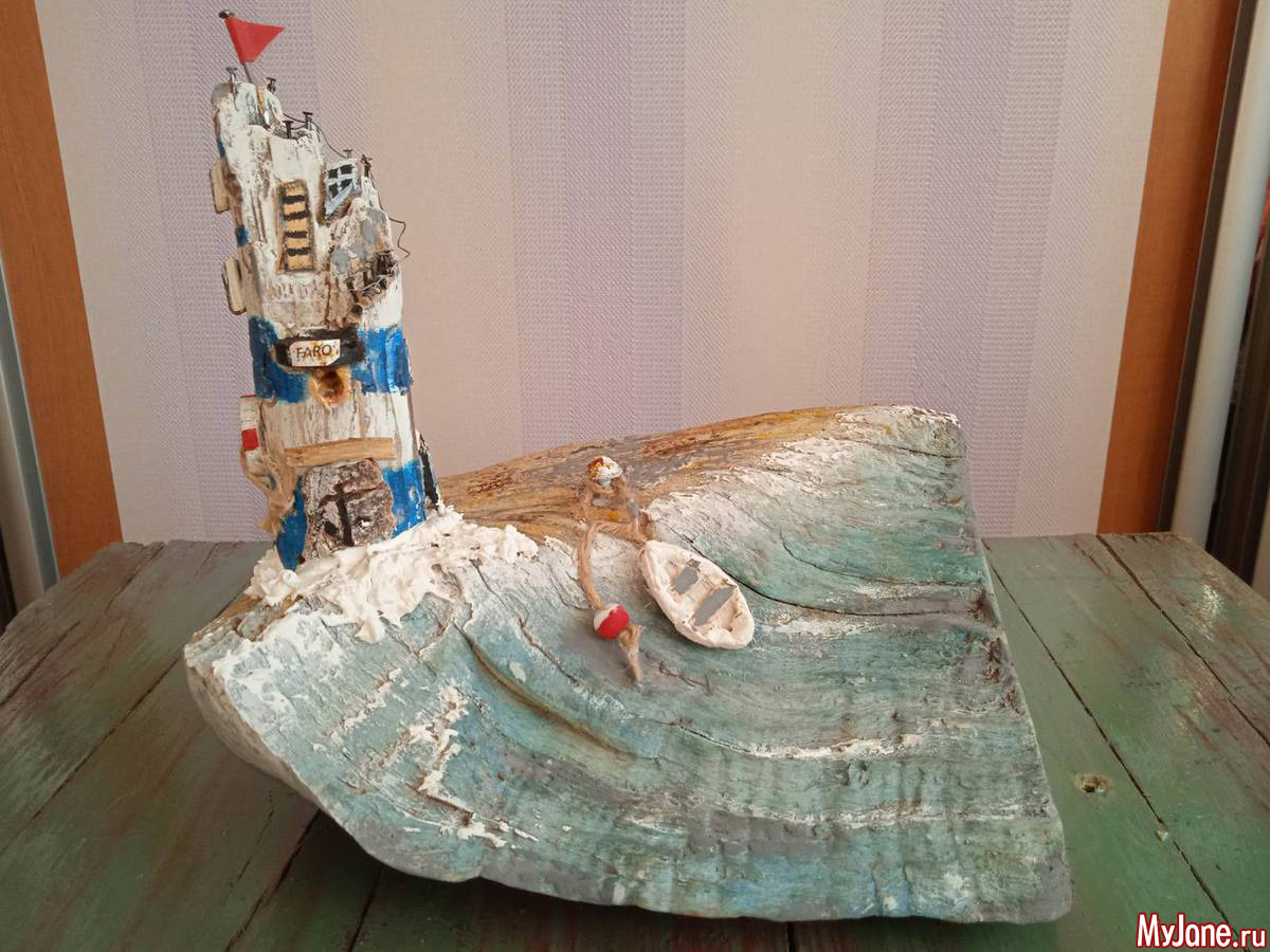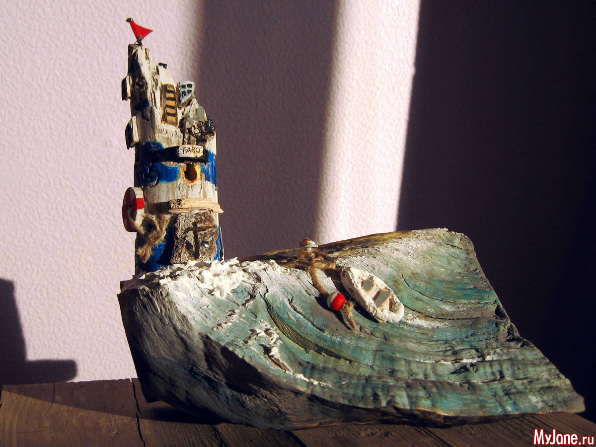 Сам стиль ДРИФТВУД не ограничивает в выборе материалов для поделок, в нем нет четких филигранных линий и рисунков. Мне нравится это направление, интересно выискивать деревяшки, состаривать их, работать с ржавым гвоздем, например. И представлять, как хранитель маяка ежедневно поднимается наверх по винтовой лестнице, чтоб зажечь свет для освещения пути морякам к дому.
