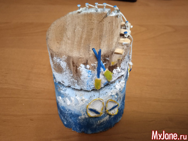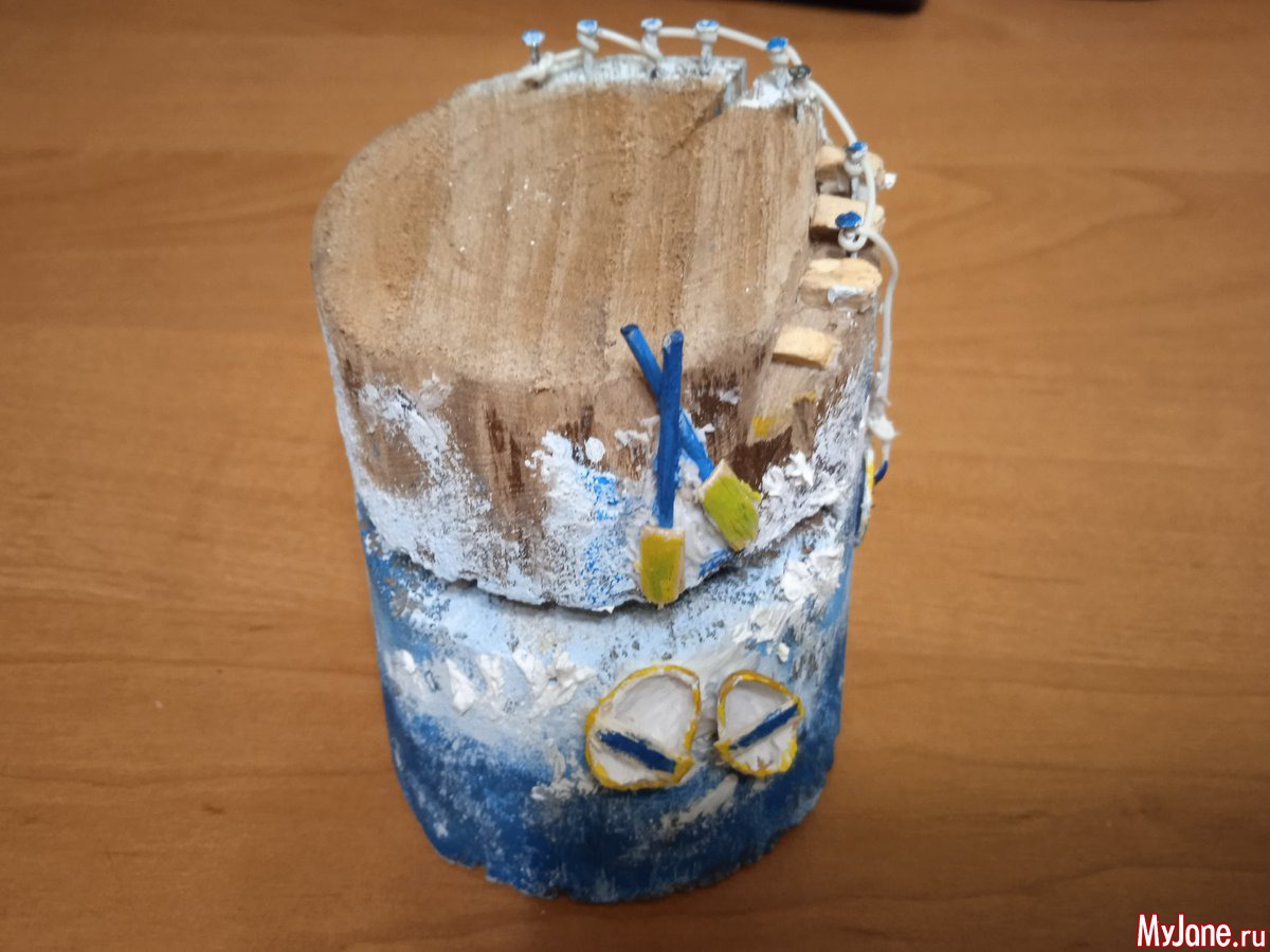 Нанесла краску, с правой стороны углубление – приклеила кусочки стружки (лестница). Две лодочки – скорлупа от фисташек, весла – зубочистки и кусочки дерева. Ограждение – маленькие гвоздики покрасила, забила в основу, протянула тонкую проволоку. Спасательный круг – покрашенная шайба.