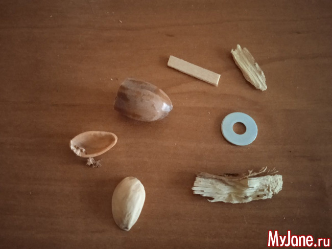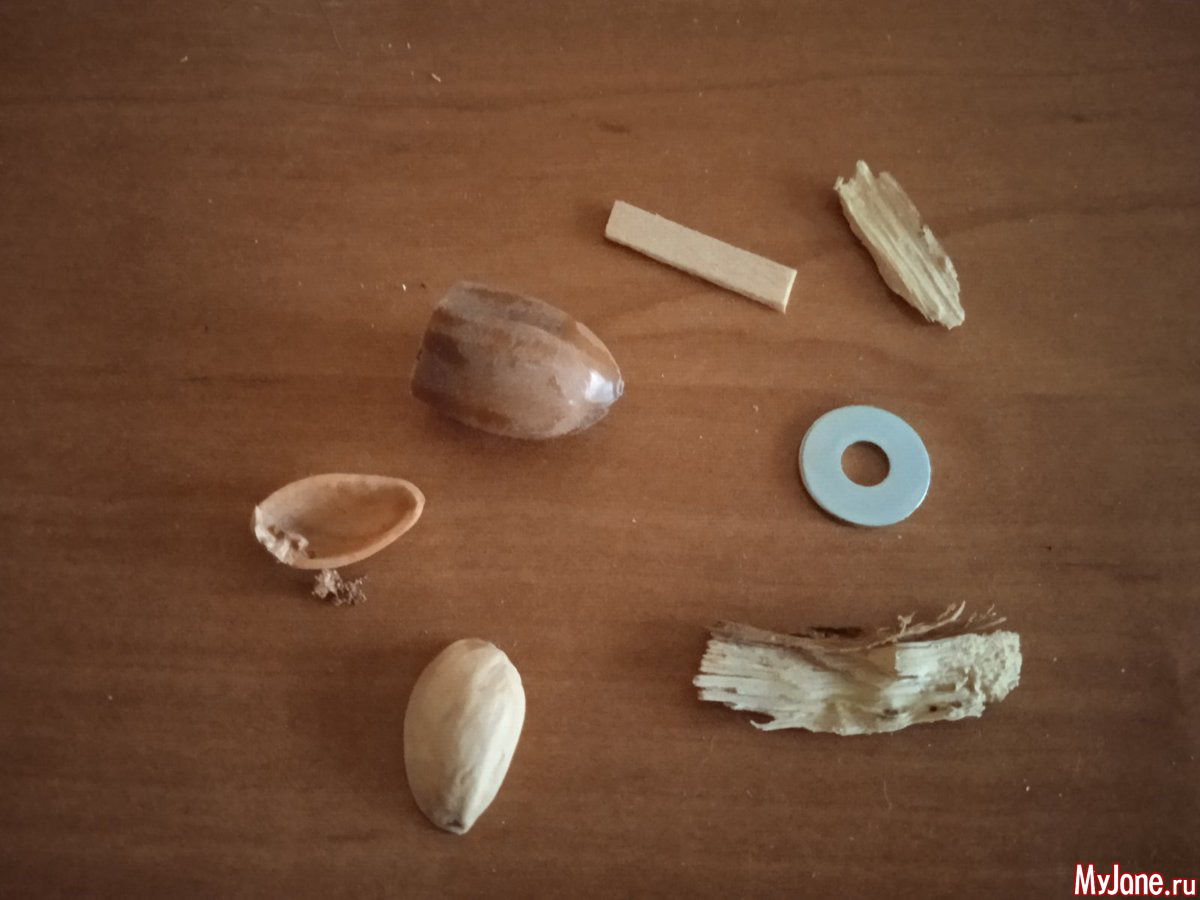 Для маяка у меня вот такой кусочек дерева, верхушка – жёлудь. Домик выпилила из тонкого бруска, кора дерева будет крышей. Остальные кусочки дерева – двери и порог маяка.