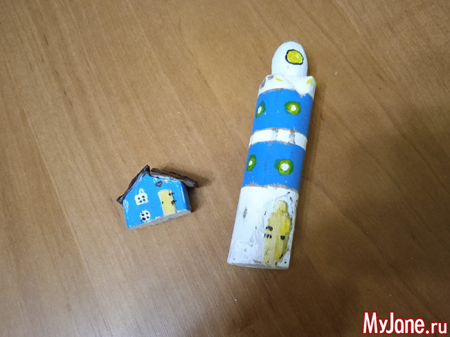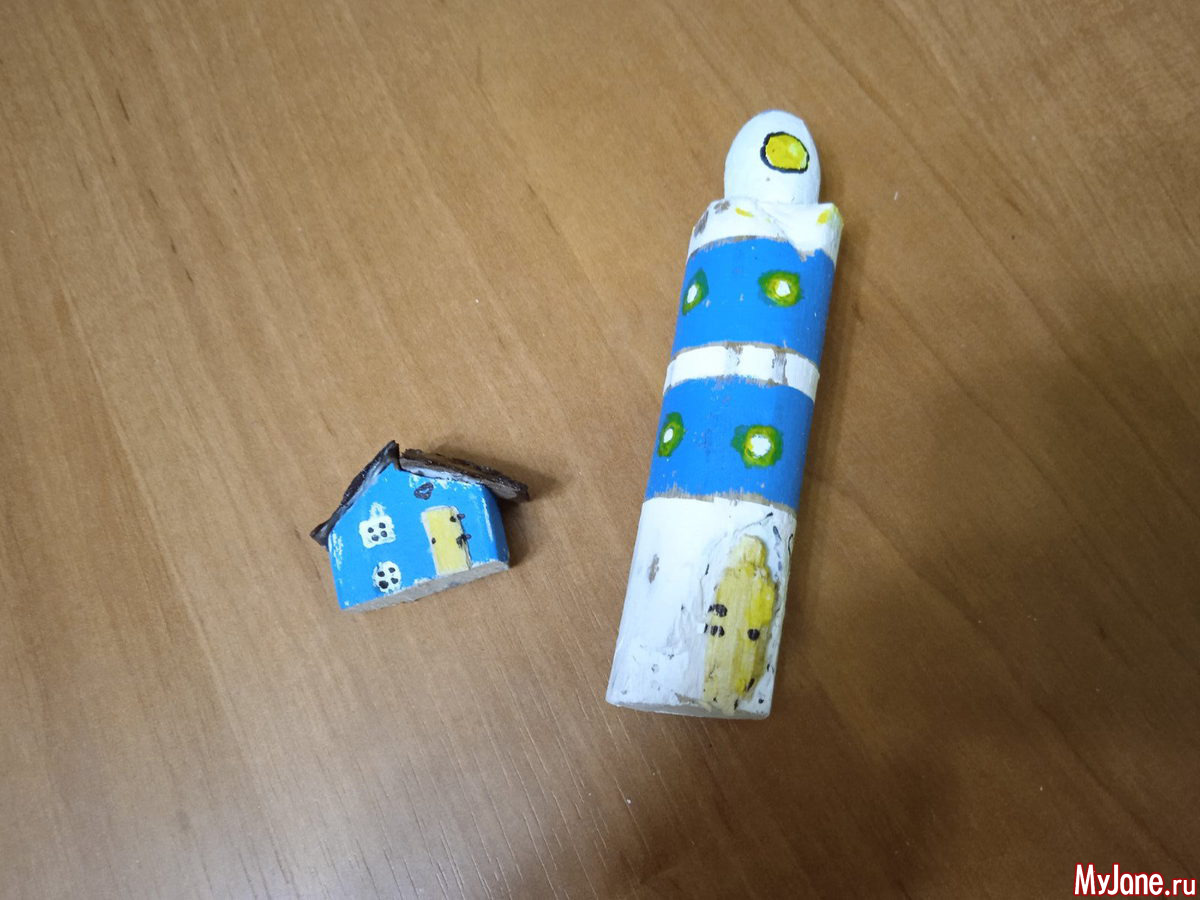 Тут просто нарисовано все уже природой - и дверь, и окна. Остаётся только зашкурить острые места и раскрасить его. Для лодочки, в данном случае, использовала кусочек стружки, но долепила форму шпаклевкой для дерева. Якорь – деревянная бусинка от старой заколки, флажок из кусочка материала закрепила на гвозде.