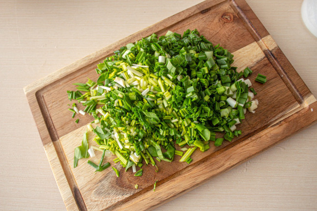 Нарезать пучок черемши, 4 вареных яйца. Посолить, поперчить и заправить сметаной.