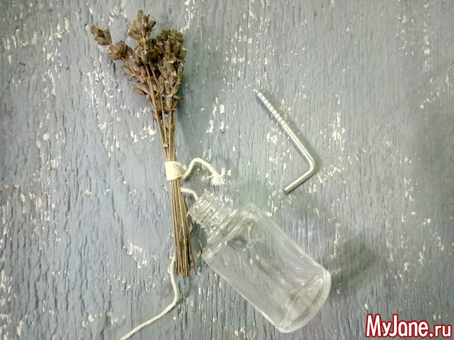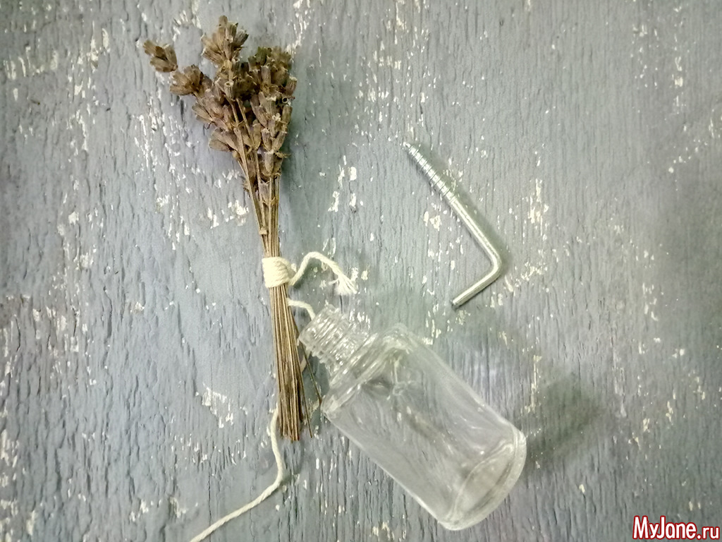 Собираю дополнительные детали. Нашла у себя вот такую бутылочку от использованного ароматизатора для помещений, она подходит по размеру и легкая. Для нее на доске закрепила крючок – он без особых усилий вкручивается в дерево.