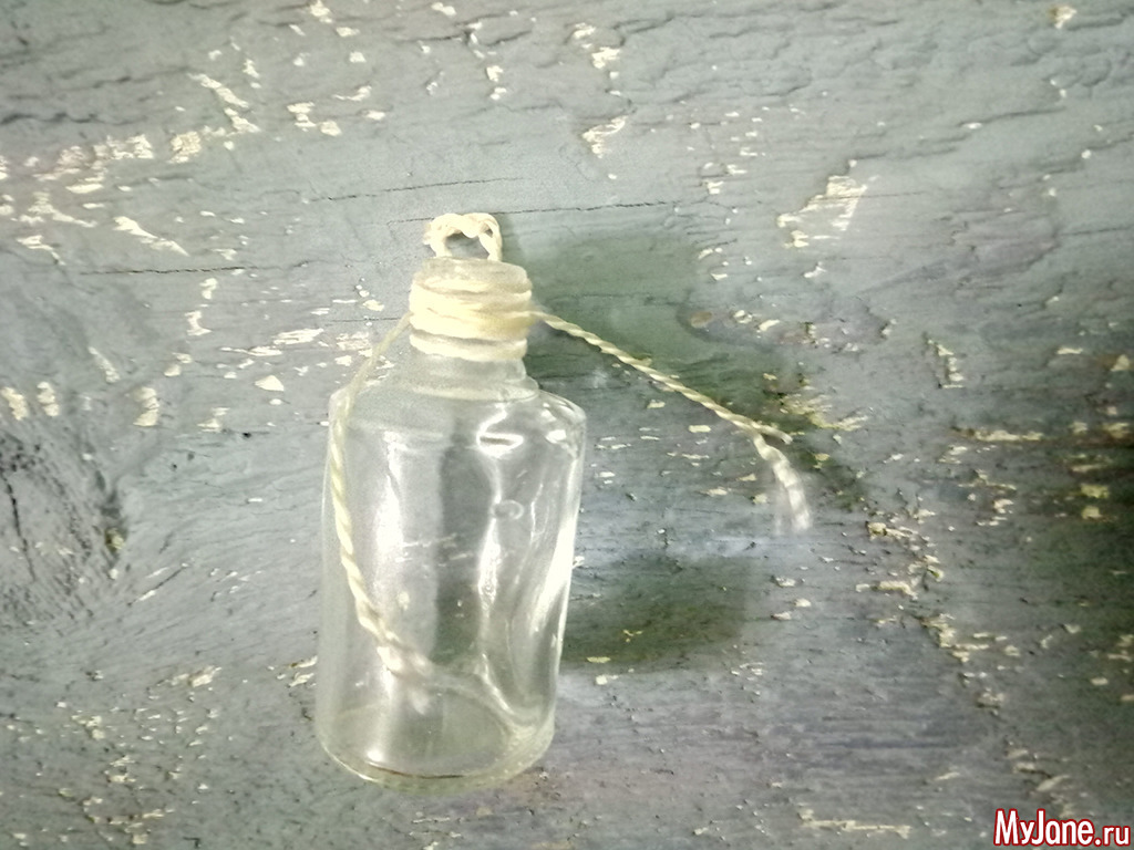 Теперь декорирую и закрепляю бутылочку. Горлышко обматываю нитью, используя жидкий клей, оставляю петлю, концы макаю в теплый воск, чтоб нитка не расслаивалась.
