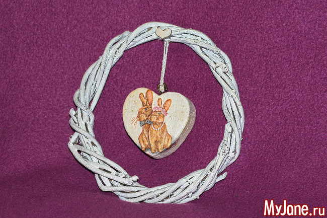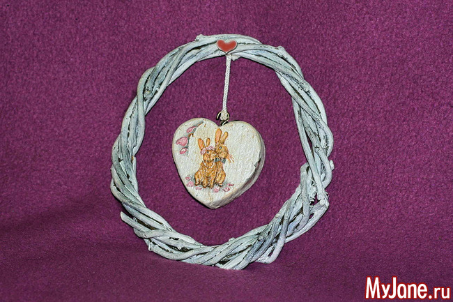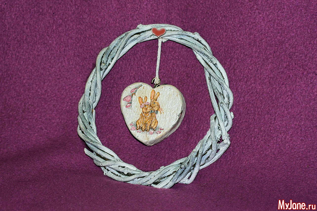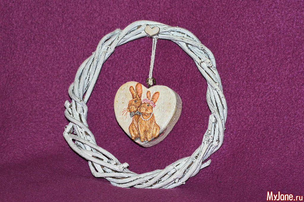 Ну, а из самого сердца я сделаю украшение для пасхальных праздников. Использую веночек из виноградной лозы, салфетку с изображением кроликов, нитка, маленький крючок и деревянное сердечко.