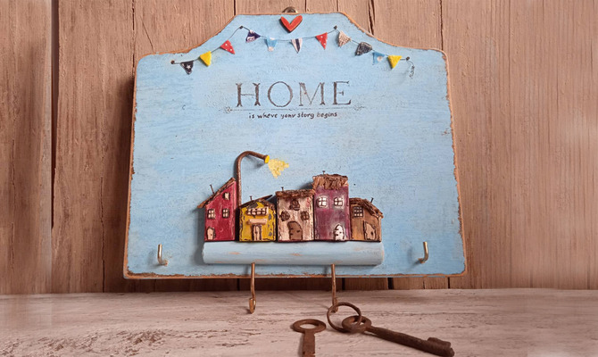 Распечатала на лазерном принтере текст в зеркальном отражении, подогнав его под нужные размеры. Наложила рисунок на основу, хорошо смочила ее жидкостью для снятия лака, с усилием прижала каждую букву ватным тампоном, от середины к краям прошлась пластиковой картой – рисунок отпечатался на дерево. Аккуратно извлекла бумагу (иногда прилипают маленькие кусочки, их убираю пинцетом). Ввинтила крючки для ключей.
