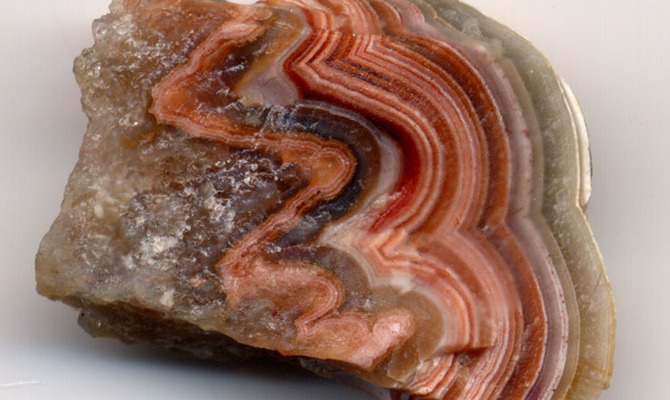 Агат имеет слоистую текстуру, наслаивающиеся друг на друга слои могут иметь разный цвет и поражать уникальностью рисунков на поверхности камня. На них можно разглядеть не только разнообразные узоры, но и целые природные пейзажи. С белыми слоями могут перемешиваться голубые, жёлтые, красные, бурые, чёрные слои.