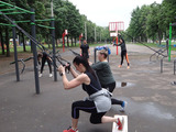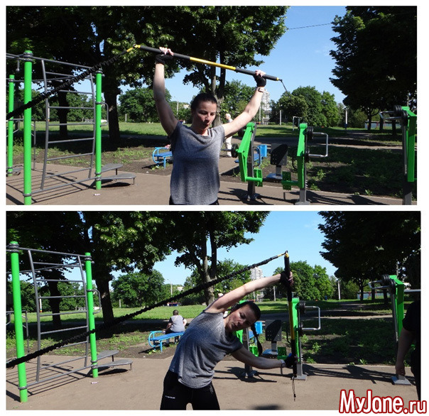 В нашем случае мы использовали специальный тренажёр Spart Rip Trainer, представляющий собой крепление, амортизатор в нейлоновом рукаве и гимнастическую палку. Закрепив его за любую перекладину на спортивной площадке, получим эффективный тренажер для роста мышц и развития мышц-стабилизаторов. Сопротивление обеспечит проработку косых наружных мышц. Такое приспособление, скорее всего, найдется у тренера. Проработать боковые мышцы вполне возможно и с помощью эластичной резинки, обеспечив её натяжение. В домашних условиях в качестве утяжелителей можно использовать и гантели. Наклоны корпуса в стороны позволят проработать наружные косые мышцы живота.2. Планка