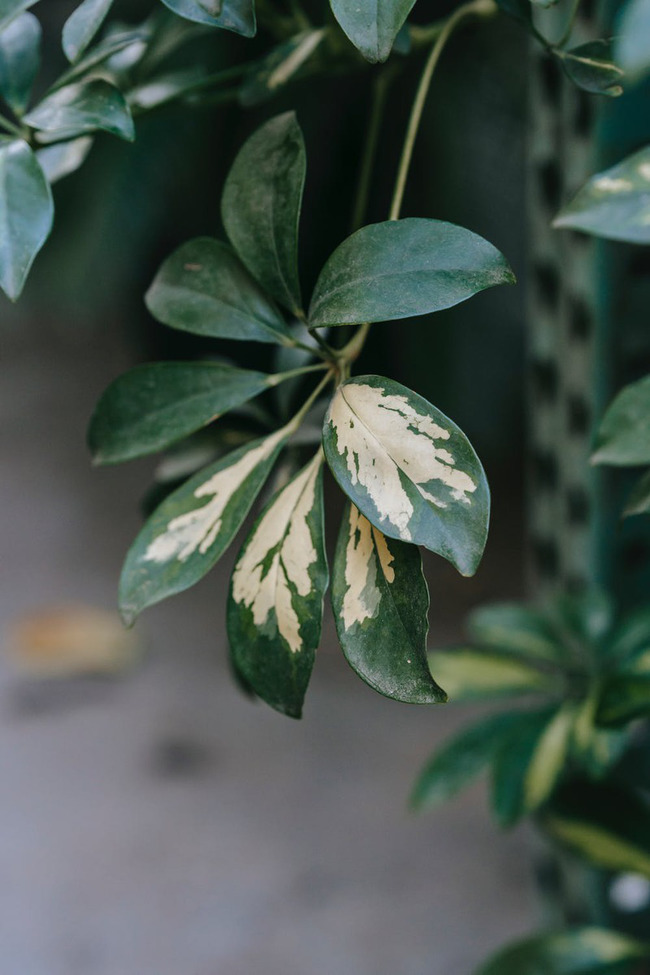Листья имеют сразу несколько оттенков зелёного, а жилки на них — светло-кремового оттенка.