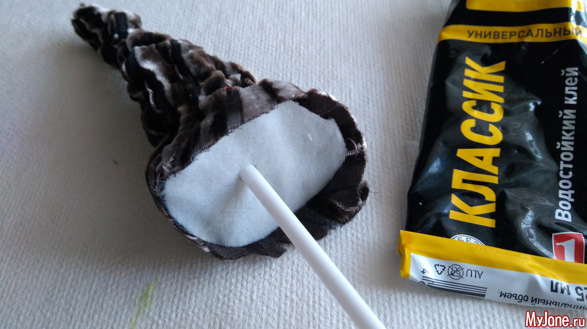 В отверстие подложки вставляем острие ножниц или палочку и в синтепоне внутри гриба формируем отверстие, в которое вставляем пластиковую трубочку, отрезаем лишнюю част трубочки. Смазываем кончик ножки (проволоки в шнурке) клеем и вставляем ножку в пластиковую трубочку внутри гриба.