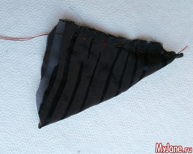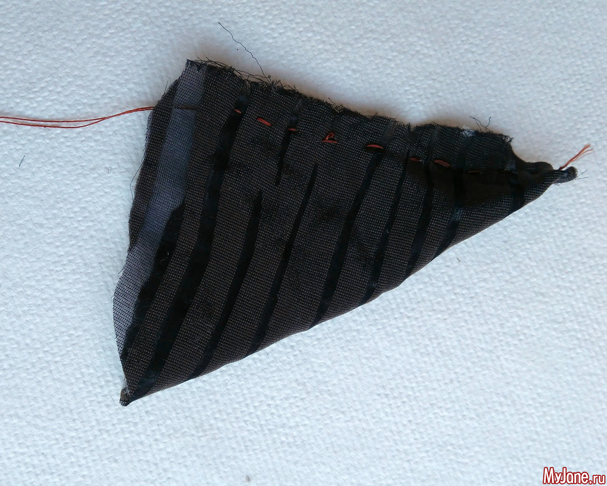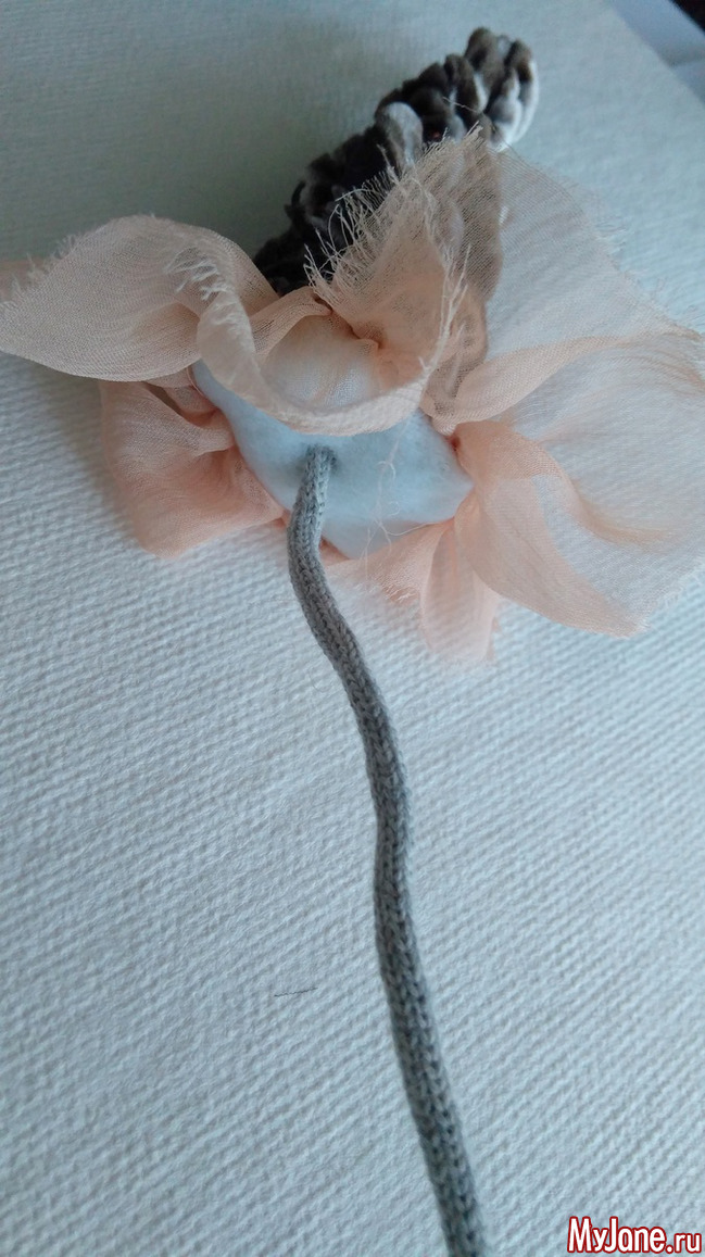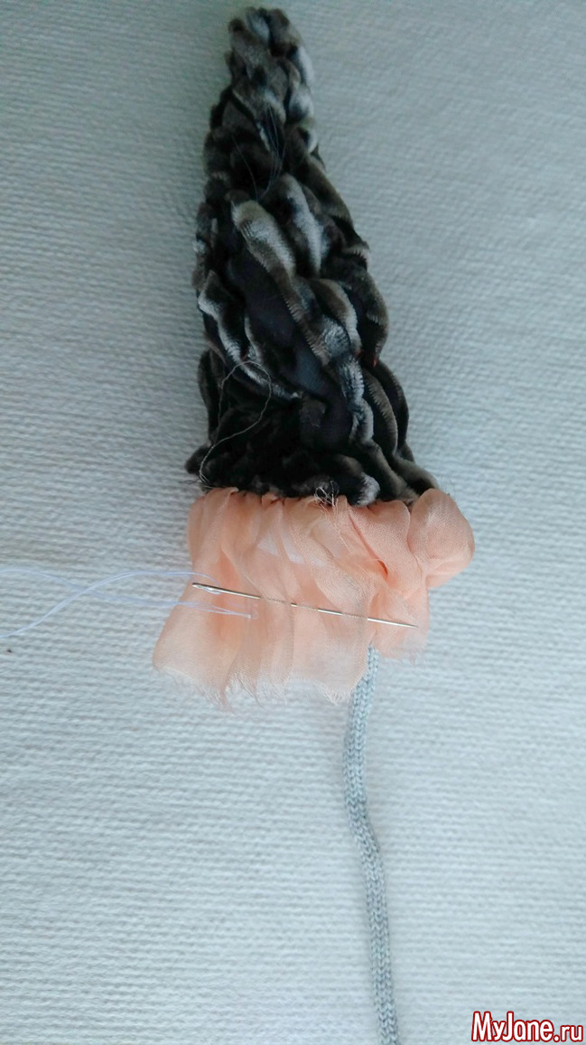 Швом вперед иголку прокладываем строчку параллельно другому краю шифоновой, потом за эту нитку стягиваем оборочку вокруг ножки.гриба и закрепляем несколькими стежками.