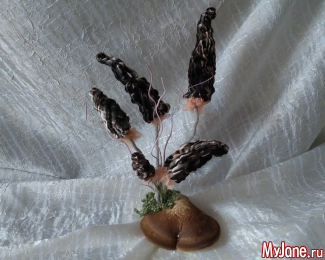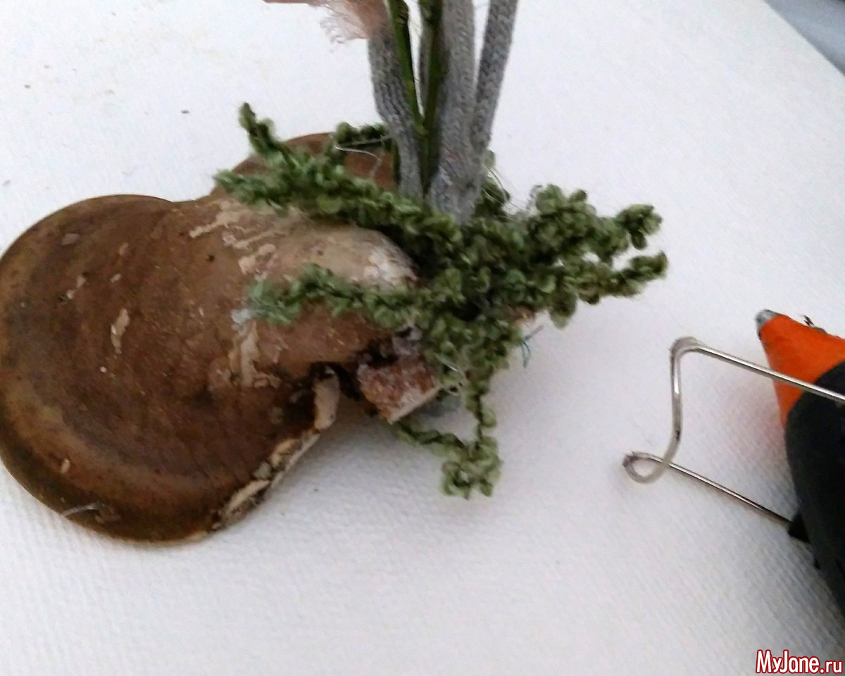 Я использовала горячий клей, а подставкой послужил гриб-трутовик. Декорируем место соединения подходящей пряжей, имитирующей траву.
