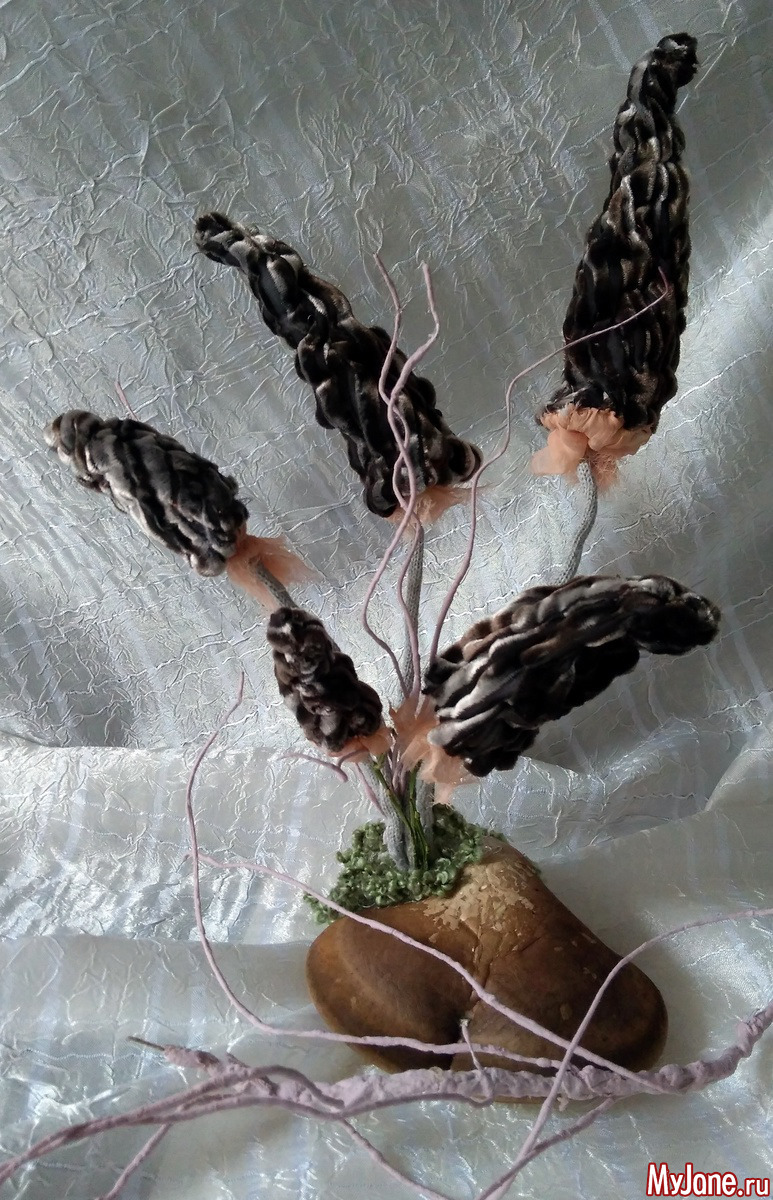 - любая тонкая ткань светлых оттенков для нижней части грибов – в настоящих грибах это пленочка, которая закрывает пластинки или трубочки под шляпкой гриба. Я использовала шифон из натурального шелка бледно-розового цвета;