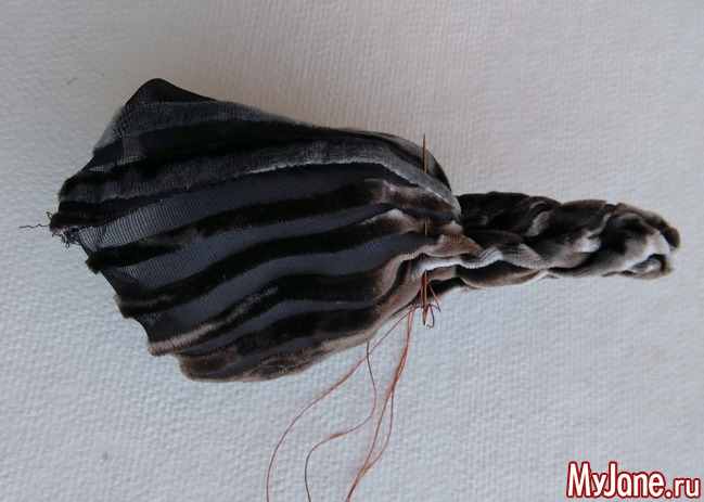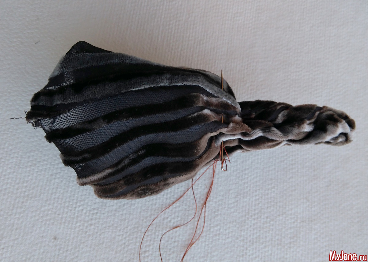 Формируем шляпку гриба, прошивая её насквозь в разных местах. Для этого используем нитку в тон ткани. Начинаем прошивать сверху вниз, формируем складочки, как у шарпея или как у гриба-строчка. Сверху стягиваем плотнее, книзу – не так плотно, чтоб получилась конусообразная форма.