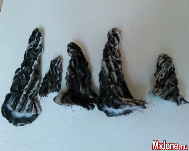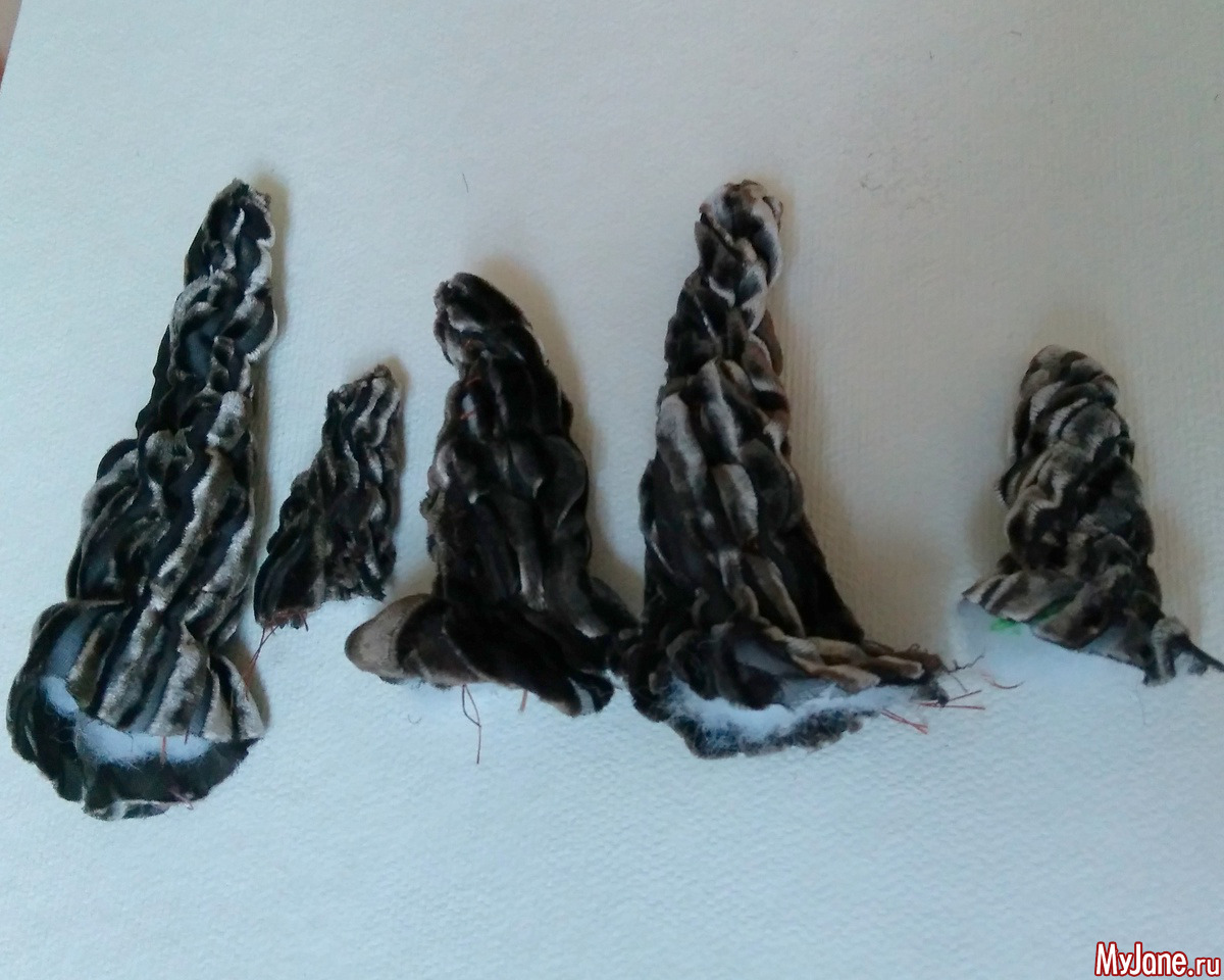 Из ткани выкраиваем что-то похожее на треугольники разных размеров – здесь точная выкройка не нужна, так как грибы будем «морщинить», и форма будет зависеть от процесса стягивания шляпки будущего гриба.